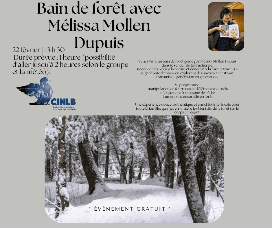 Venez vivre un bain de forêt guidé par Mélissa Mollen Dupuis dans le sentier de la Prucheraie. Reconnectez-vous à la nature et découvrez la forêt à travers le regard autochtones, tout en explorant les savoirs ancestraux transmis de génération en génération.